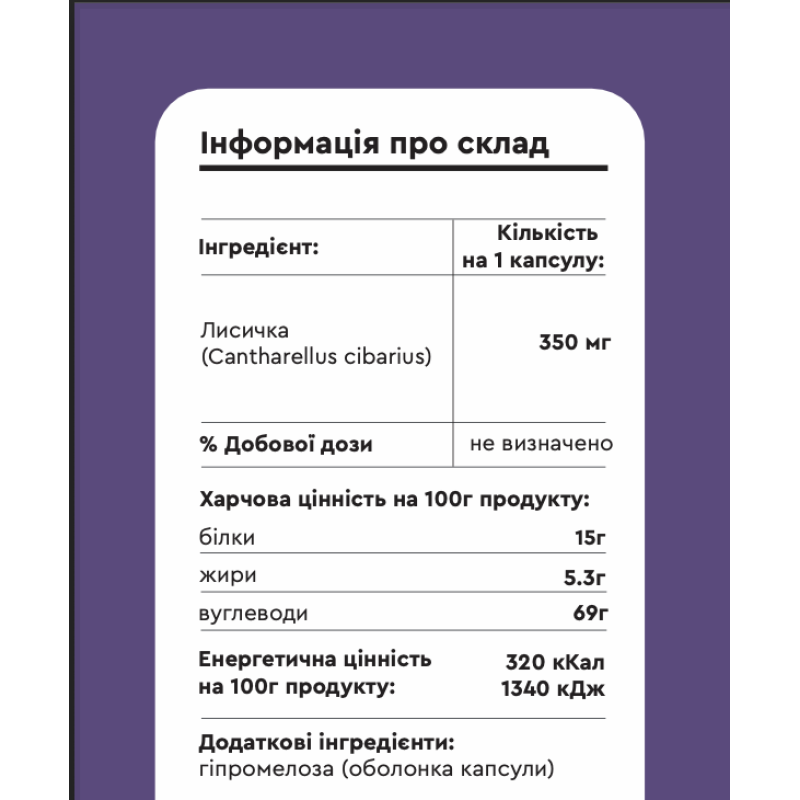 Ingredients: Chanterelle (Cantharellus cibarius) fruiting body powder - 100%. Other ingredients: hypromellose (capsule shell). Suggested use: 2-3 capsules 1-3 times daily during or after meals, with water. Contraindications: individual intolerance to components, pregnancy, lactation. Caution: not a medicinal product, not intended as a substitute for a varied diet, consult a physician before use. Dietary supplement. Non-GMO.
