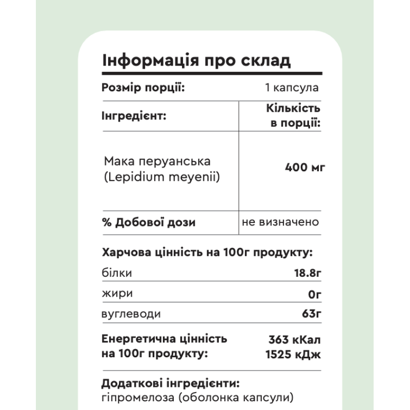 Склад: Порошок кореня чорної маки (Lepidium meyenii); рослинна капсула (гіпромелоза).
