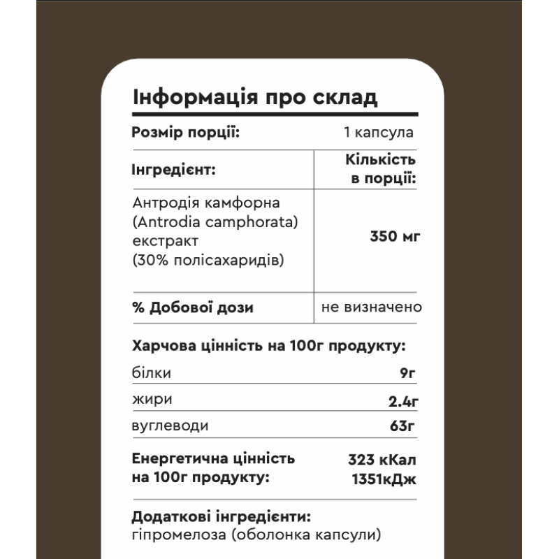 Состав: экстракт мицелия Antrodia camphorata 350 мг (стандартизированное содержание полисахаридов 30%), оболочка капсулы – гипромелоза (HPMC).