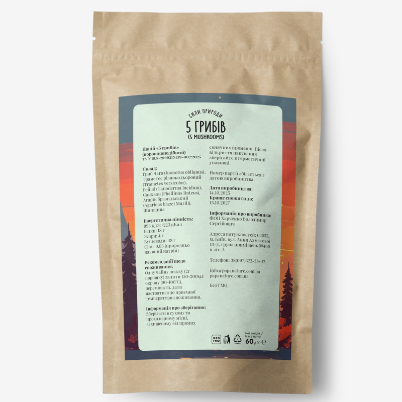 Напиток 5 грибов – это уникальная комбинация функциональных грибов (чага, траметес, рейши, санхван, агарик бразильский) с добавлением шиповника. Формула предназначена для мягкой поддержки организма, ежедневного ощущения энергии и жизненного баланса. Напиток не содержит синтетических примесей, только натуральный грибной и растительный порошок.