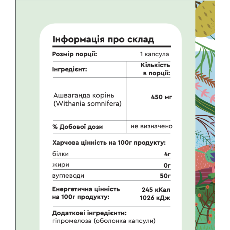 Склад: корінь Ашваганди (Withania somnifera) 450мг у капсулі