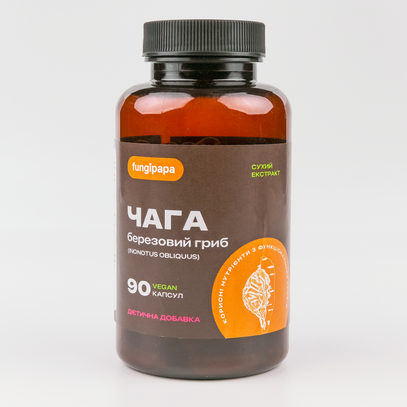 Екстракт Чаги (Inonotus obliquus) у капсулах. Цей унікальний продукт втілює в собі всю силу Чаги, яка цінується за свої антиоксидантні, протизапальні та імунопідтримуючі властивості, тепер доступна в зручній формі капсул для вашого щоденного догляду за здоров'ям.