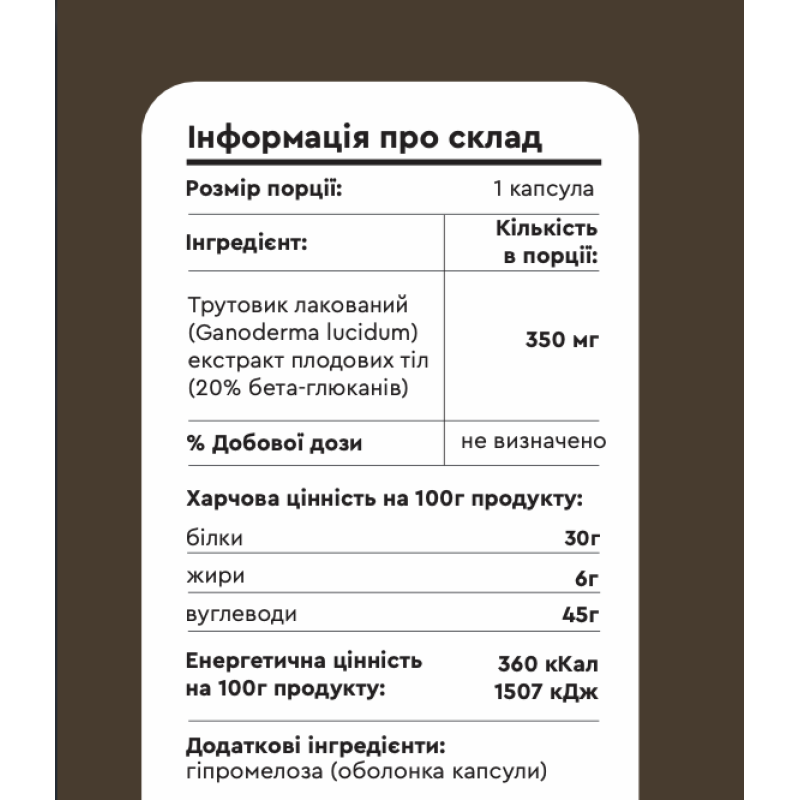 Склад: Рейші (Ganoderma lucidum) екстракт плодових тіл - 100% (стандартизований вміст бета-глюканів 20%). Додаткові інгредієнти: гіпромелоза (оболонка капсули).